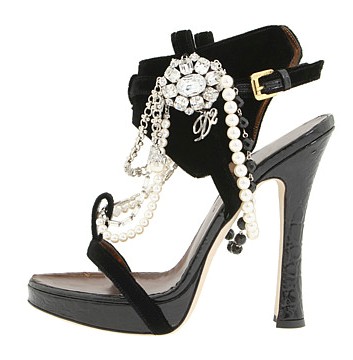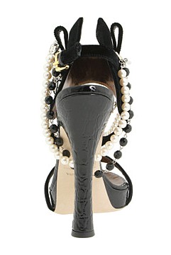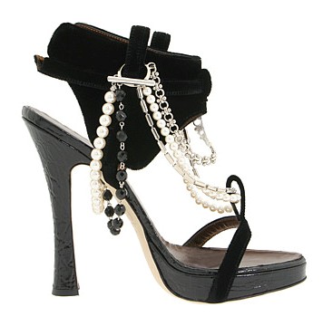 Fekete pántos szandál gyöngysorokkal, kristállyal, selyemszalagokkal díszítve a DSquared-től.